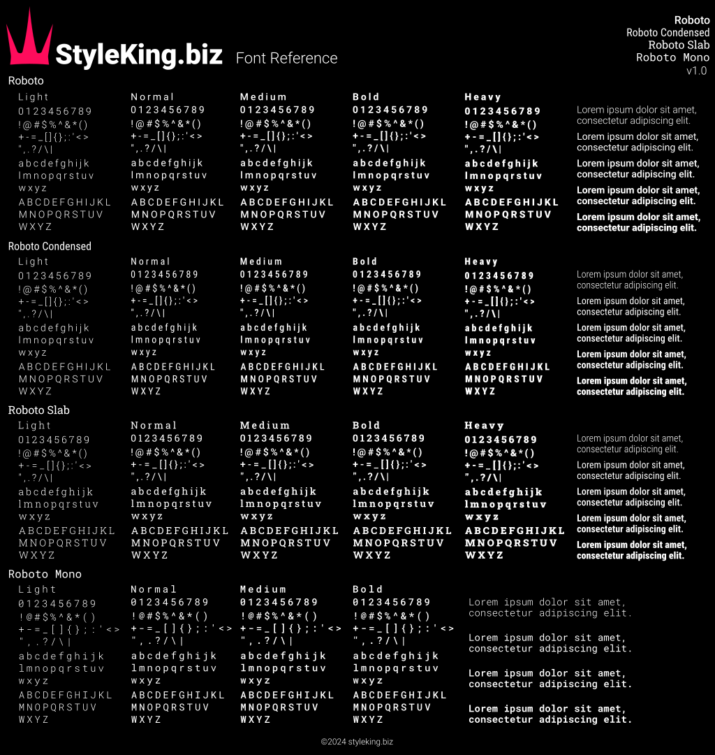 This is a font reference for the Roboto font, to serve as a visual aid when choosing fonts and font weights.